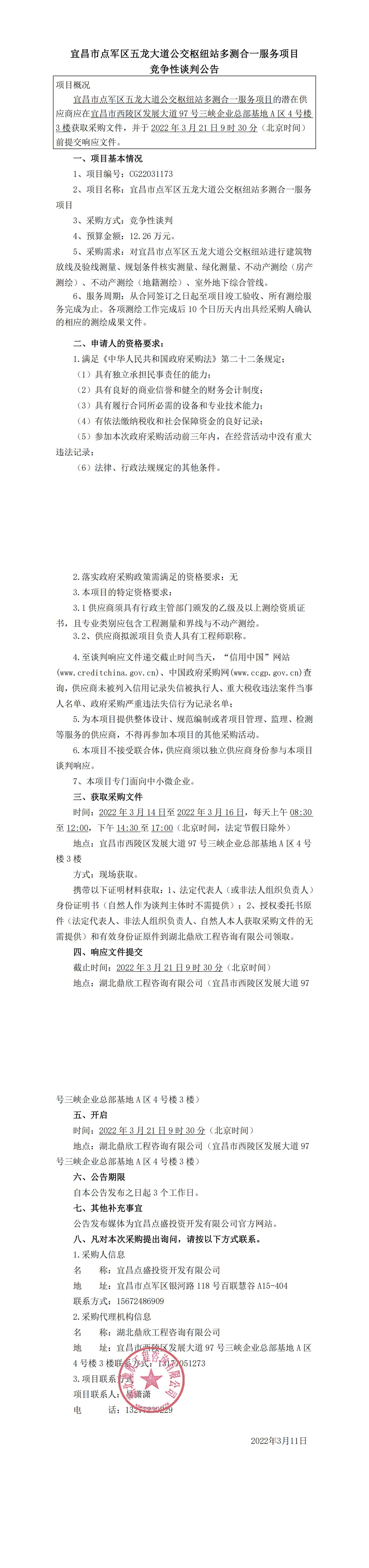 宜昌市點軍區(qū)五龍大道公交樞紐站多測合一服務(wù)項目競爭性談判公告