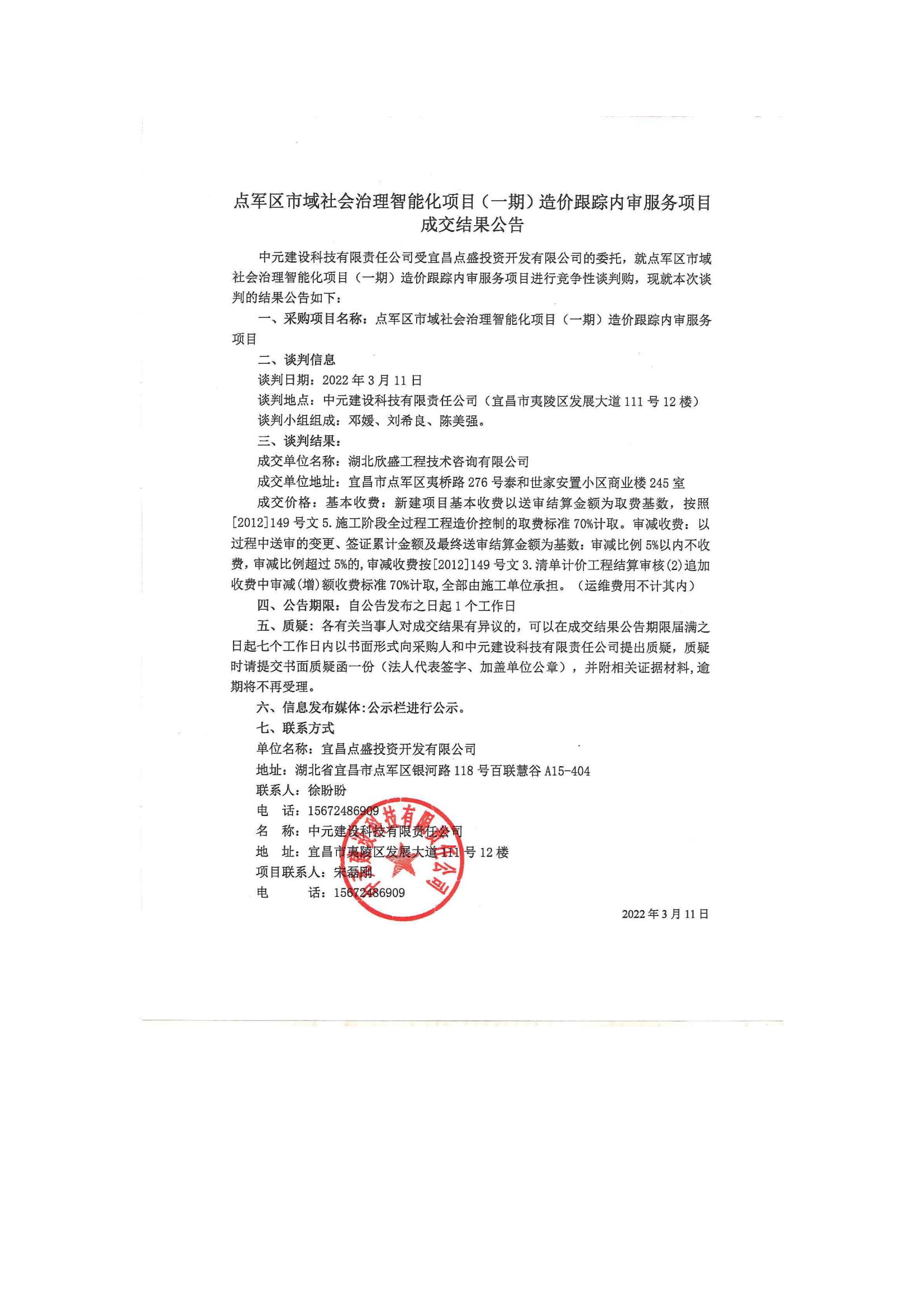 點軍區(qū)市域社會治理智能化項目(一期)造價跟蹤內(nèi)審服務項目成交公告