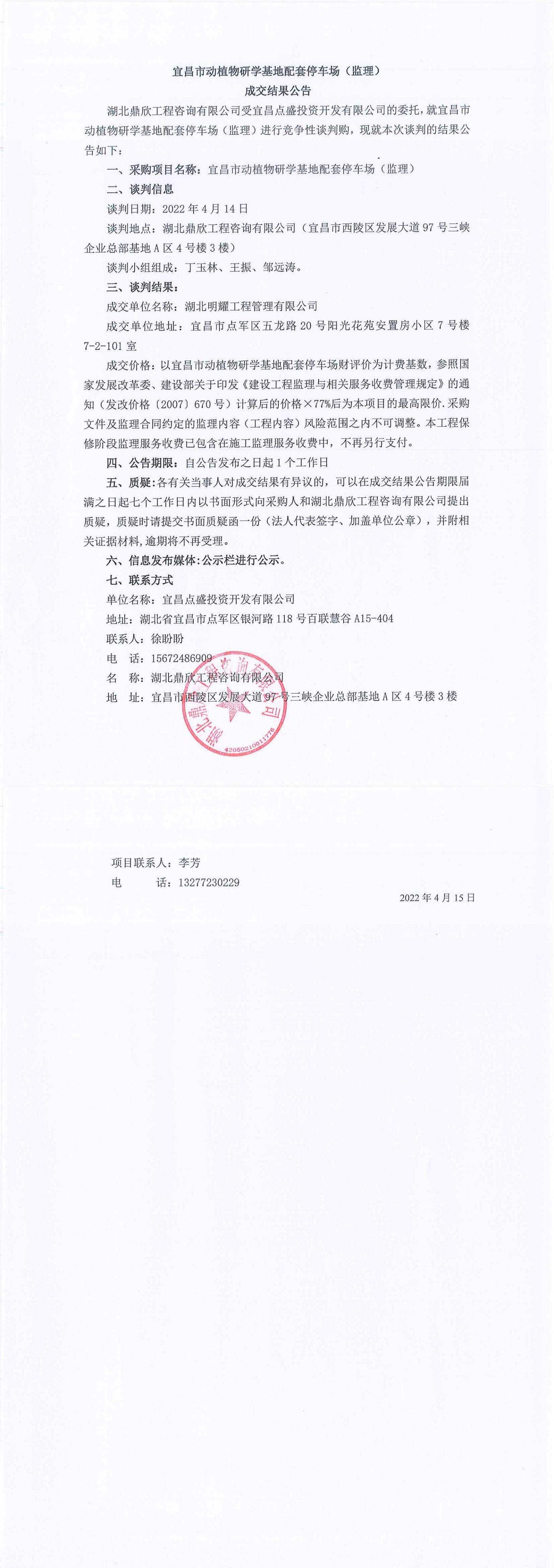 宜昌市動植物研學基地配套停車場監(jiān)理成交公告