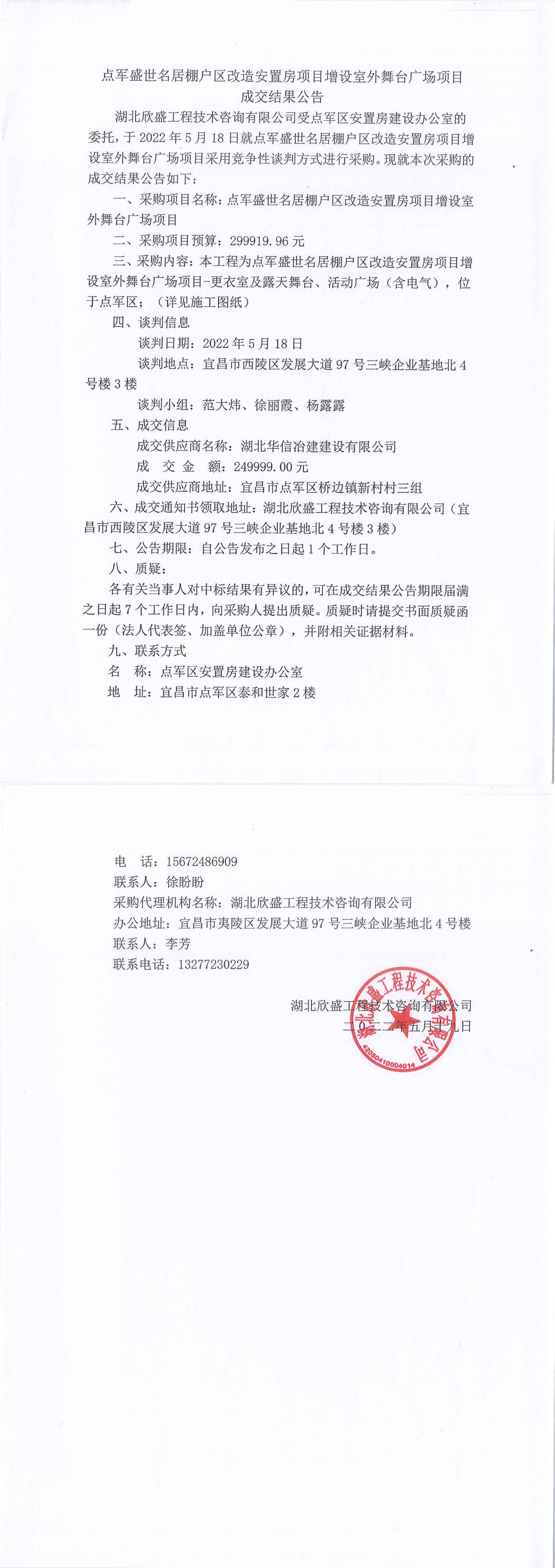 點(diǎn)軍盛世名居棚戶區(qū)改造安置房項(xiàng)目增設(shè)室外舞臺(tái)廣場(chǎng)項(xiàng)目成交公告