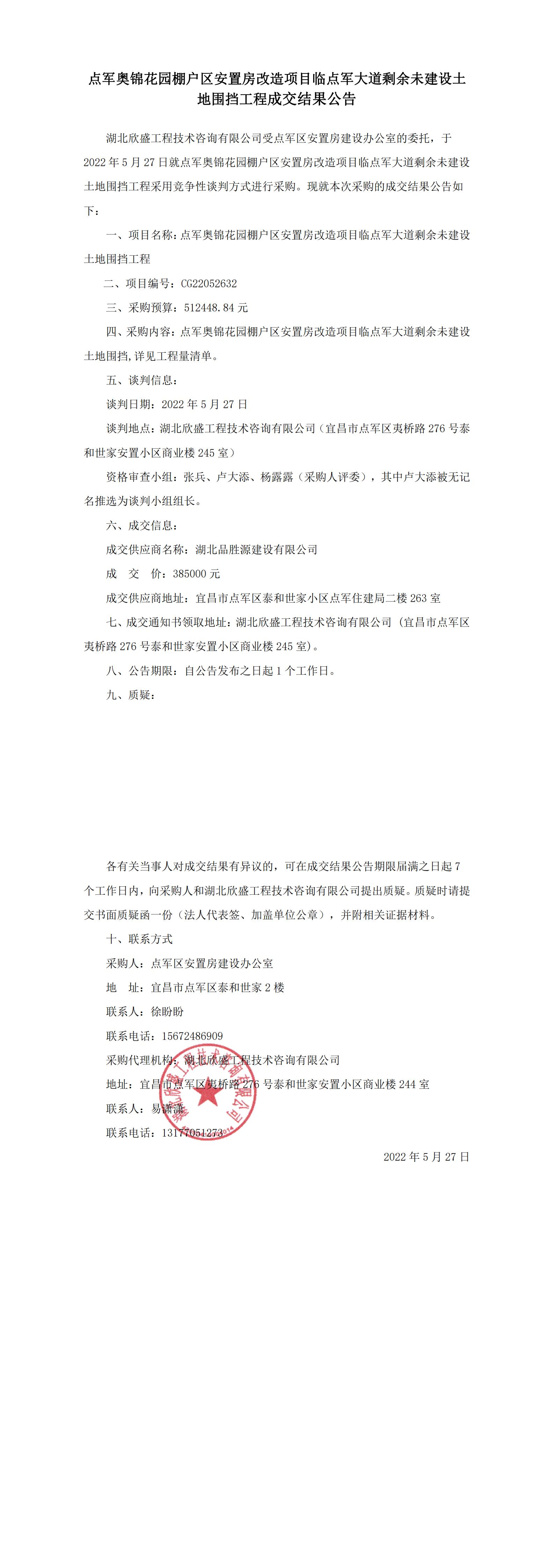 點(diǎn)軍奧錦花園棚戶區(qū)安置房改造項(xiàng)目臨點(diǎn)軍大道剩余未建設(shè)土地圍擋工程成交結(jié)果公告