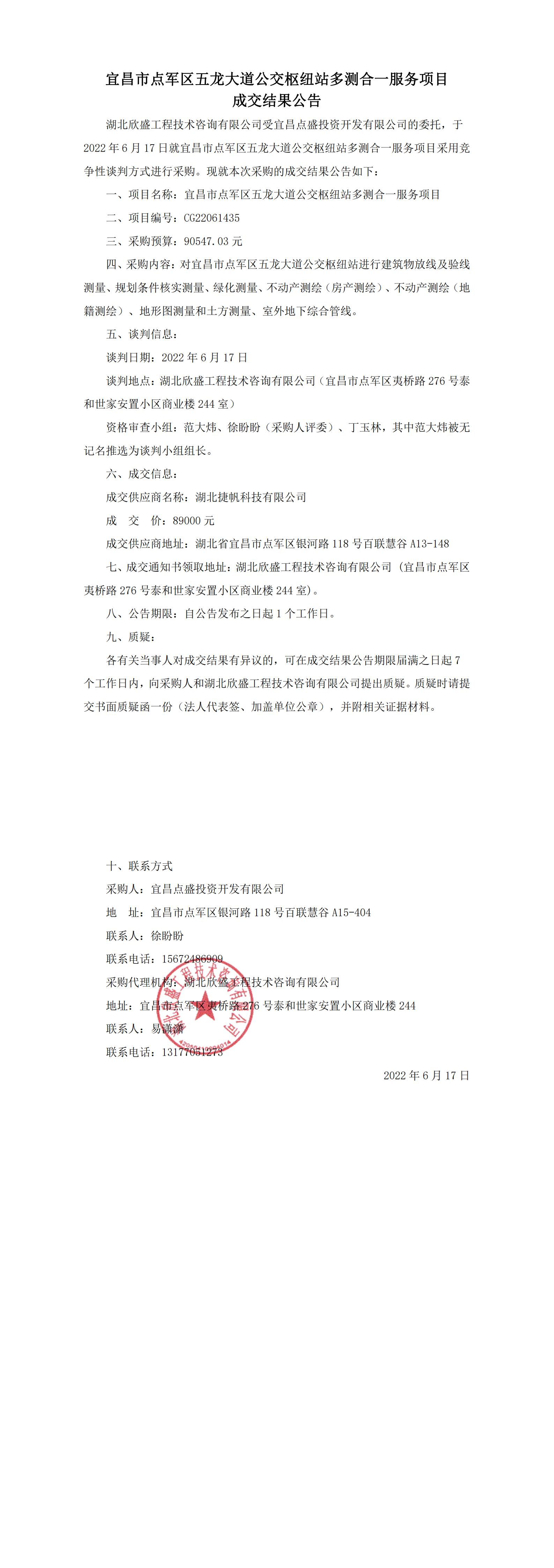 宜昌市點軍區(qū)五龍大道公交樞紐站多測合一服務(wù)項目成交結(jié)果公告