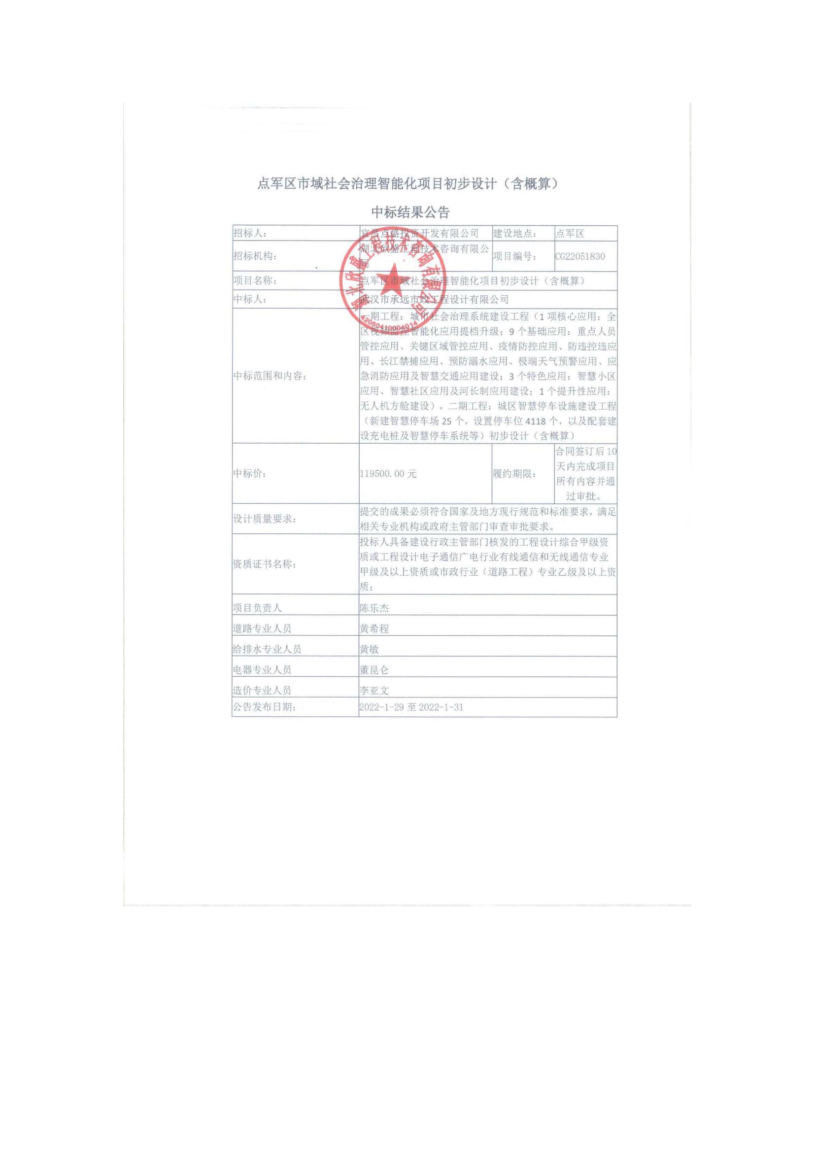 點軍區(qū)市域社會治理智能化項目初步設計(含概算)中標結果公告