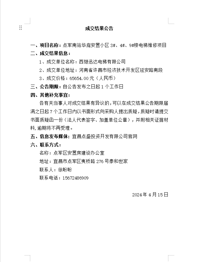 點軍南站華庭安置小區(qū)3#、4#、9#樓電梯維修項目成交公告