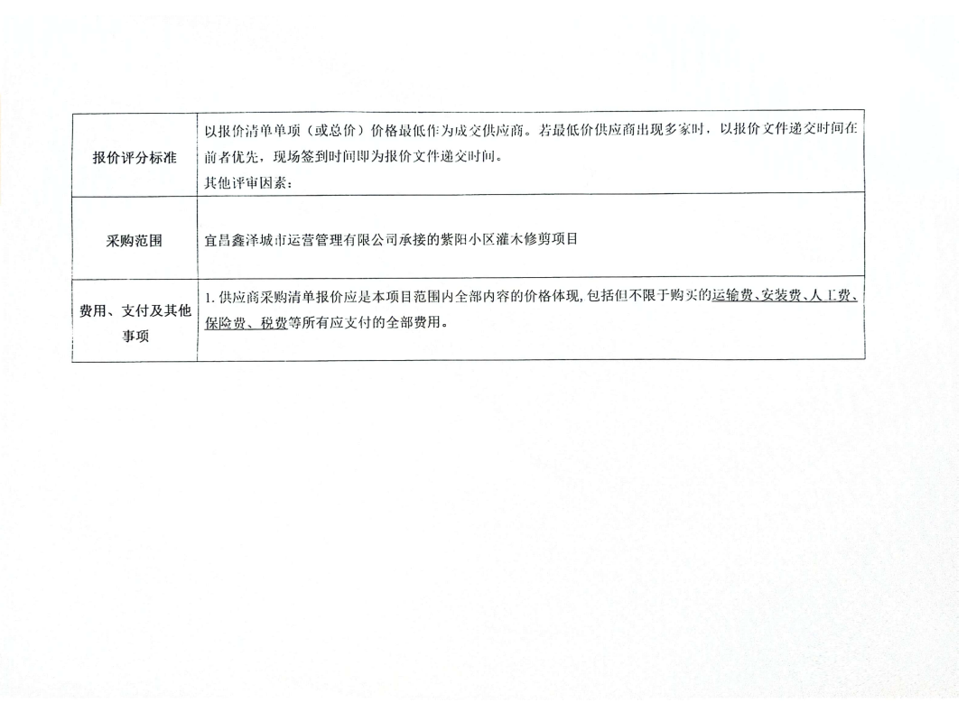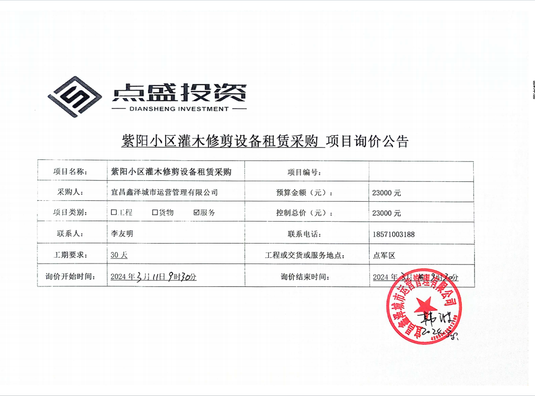 宜昌鑫澤城市運營管理有限公司管紫陽小區(qū)灌木修剪設備租賃采購項目詢價公告