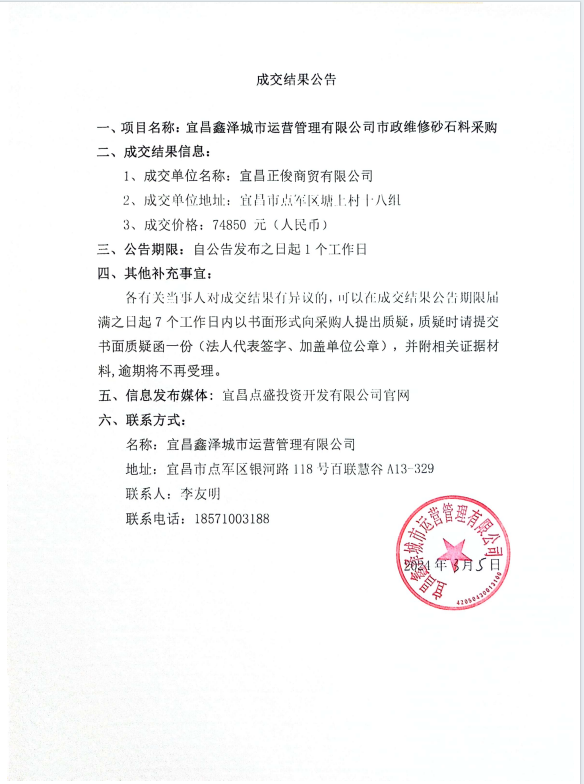 宜昌鑫澤城市運(yùn)營管理有限公司市政維修砂石料采購項目成交公告