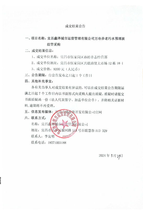萬壽養(yǎng)老污水預(yù)埋波紋管采購成交公告