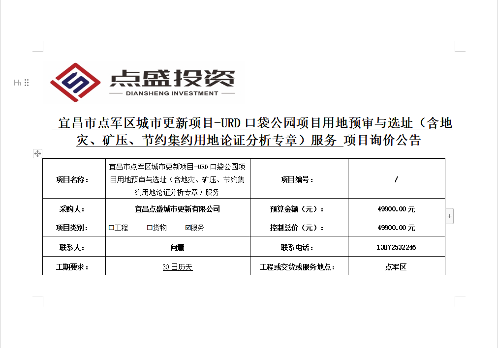 宜昌市點(diǎn)軍區(qū)城市更新項(xiàng)目-URD口袋公園項(xiàng)目用地預(yù)審與選址(含地災(zāi)、礦壓、節(jié)約集約用地論證分析專章)服務(wù)詢價公告