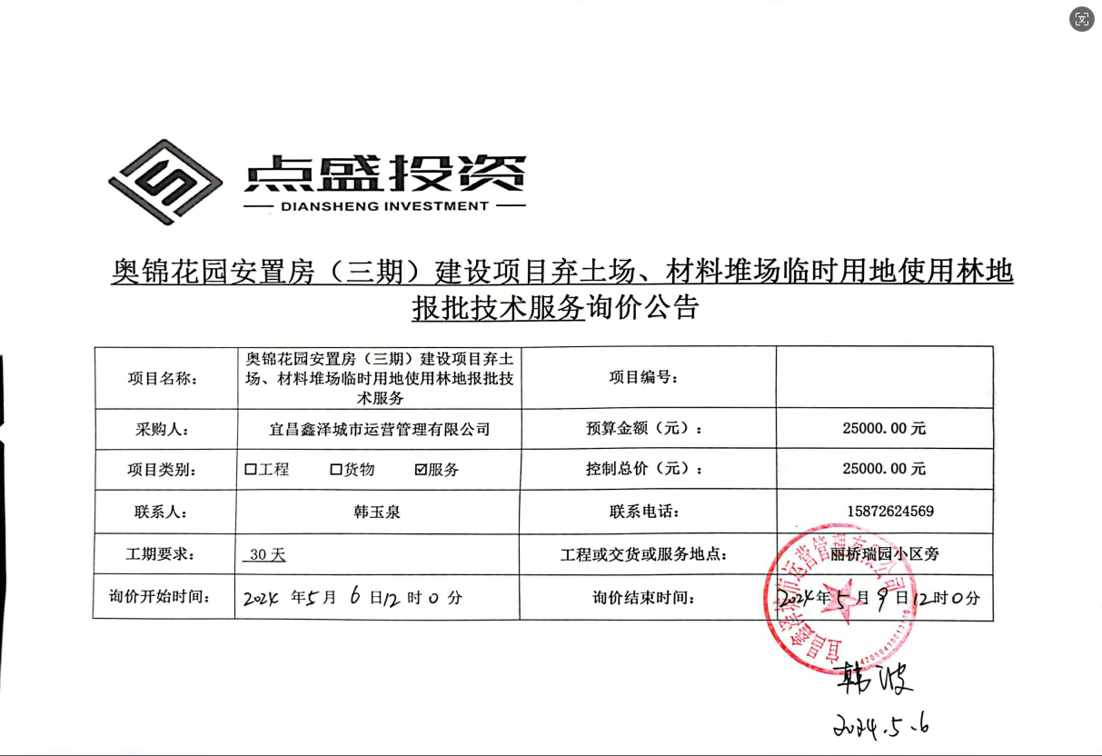 奧錦花園安置房(三期)建設項目棄土場、材料堆場臨時用地使用林地報批技術服務詢價公告