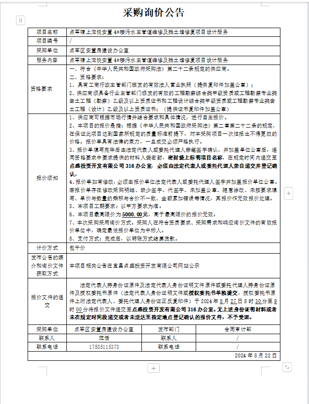 點軍塘上龍悅安置4#樓污水主管道維修及擋土墻修復(fù)項目設(shè)計服務(wù)詢價公告