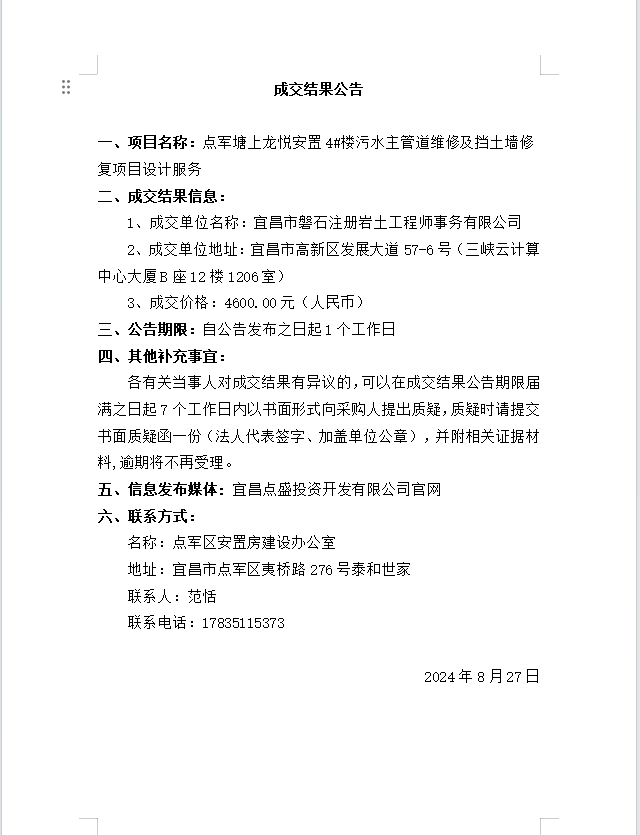 點軍塘上龍悅安置4#樓污水主管道維修及擋土墻修復(fù)項目設(shè)計服務(wù)成交公告