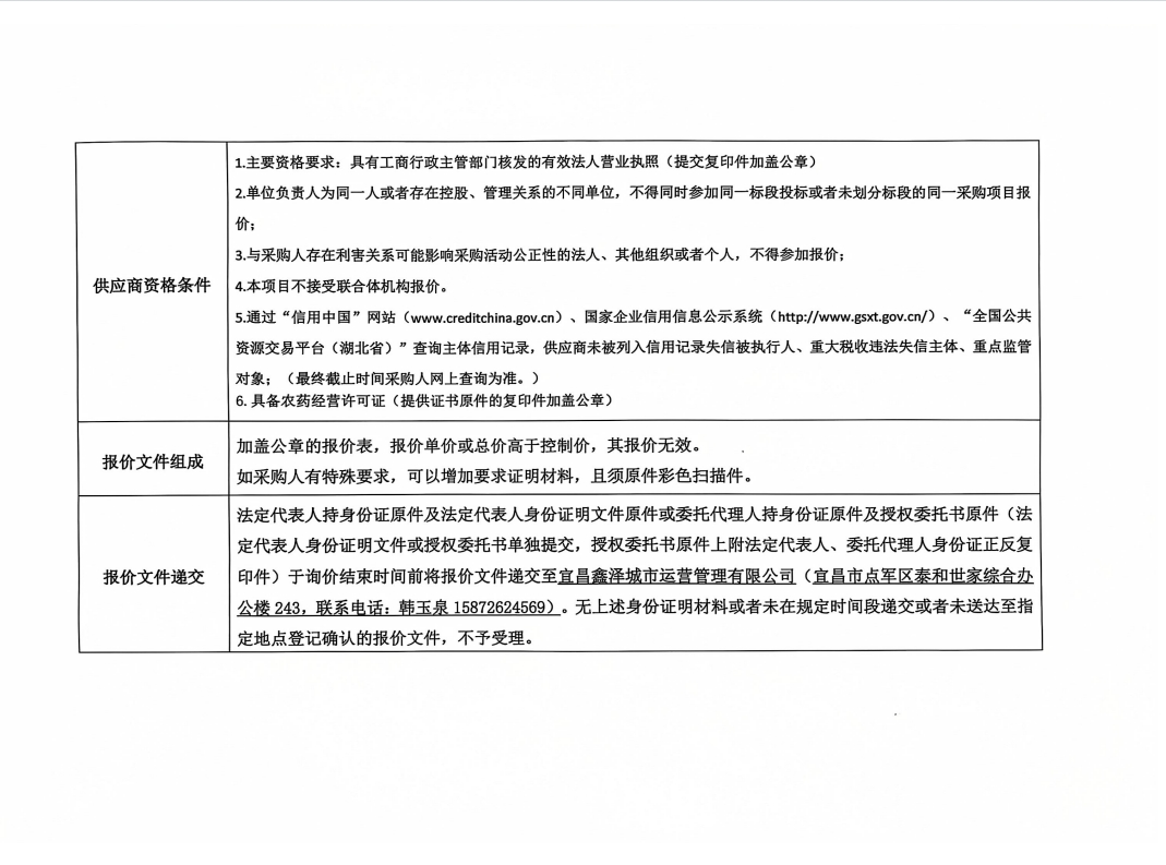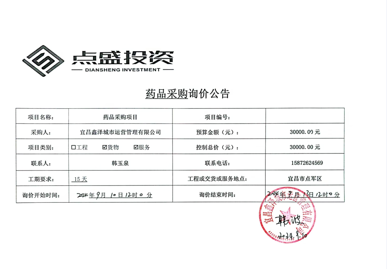 宜昌鑫澤城市運營管理有限公司藥品采購項目詢價公告