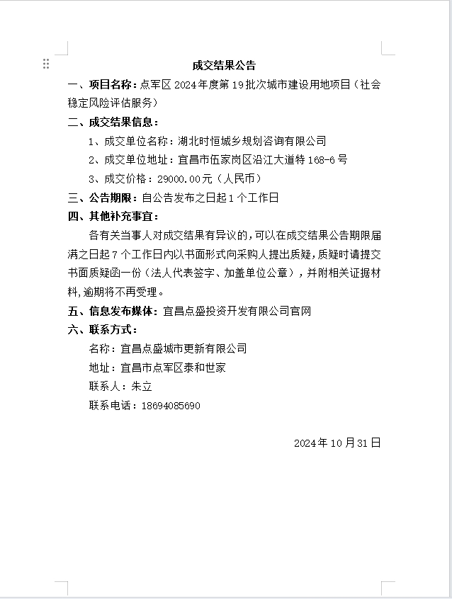 點(diǎn)軍區(qū)2024年度第19批次城市建設(shè)用地項(xiàng)目(社會穩(wěn)定風(fēng)險(xiǎn)評估服務(wù))成交公告