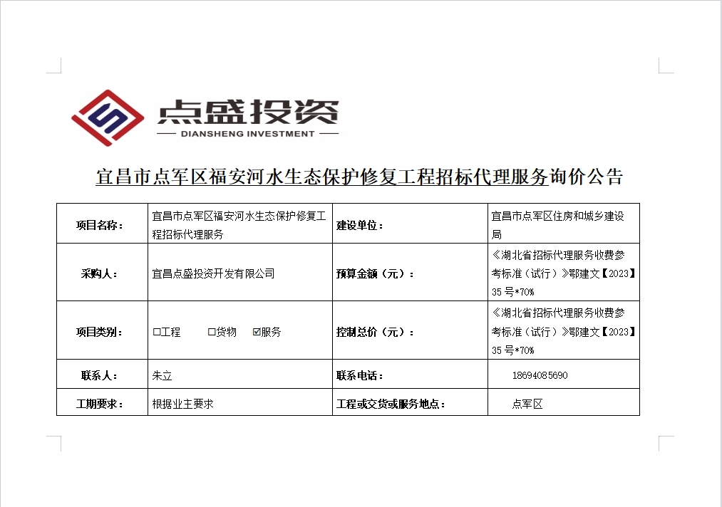宜昌市點軍區(qū)福安河水生態(tài)保護修復(fù)工程招標代理服務(wù)詢價公告