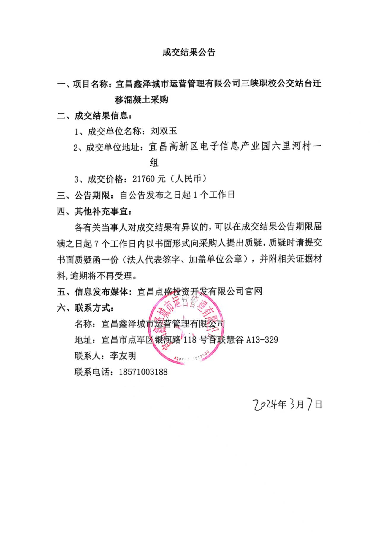 三峽職校公交站臺遷移混凝土采購成交公告