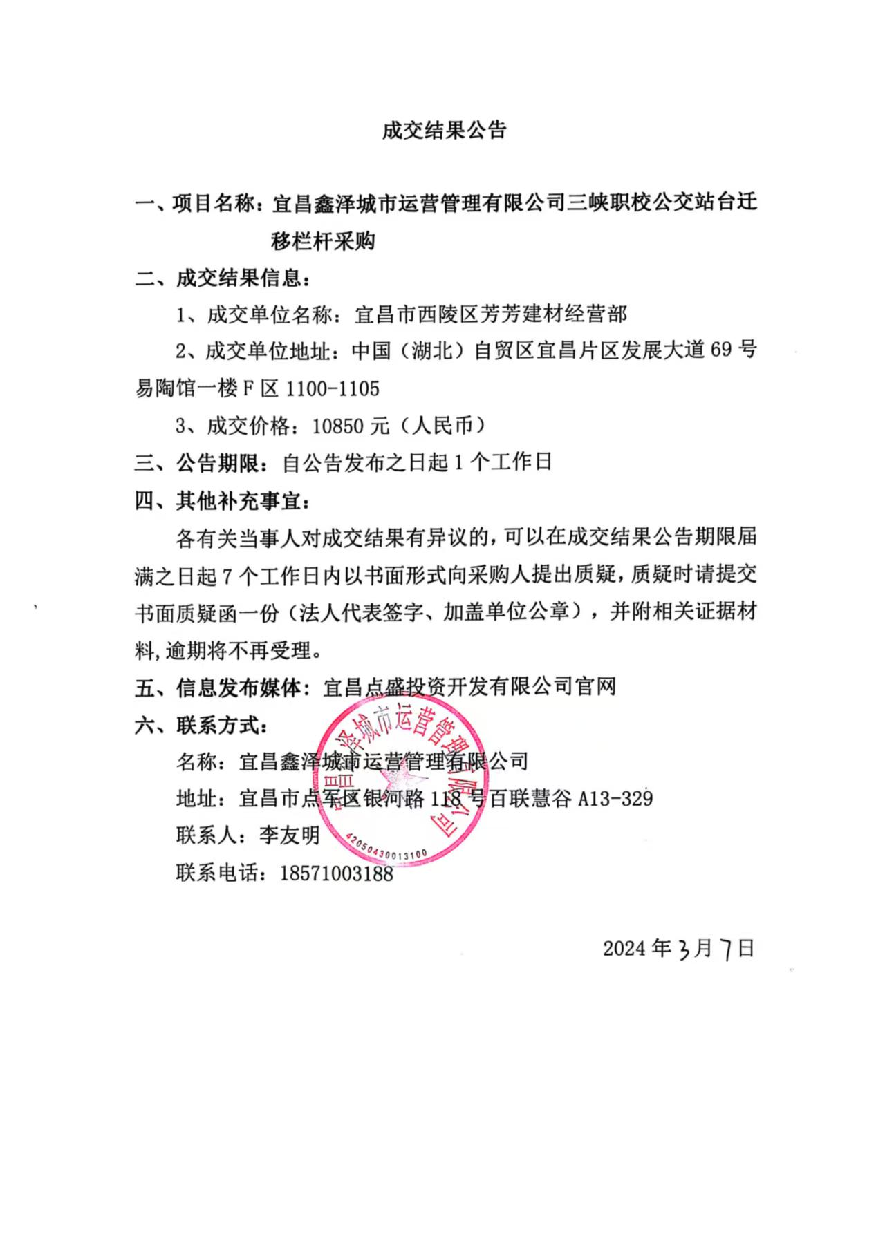 三峽職校公交站臺(tái)遷移欄桿采購(gòu)成交公告